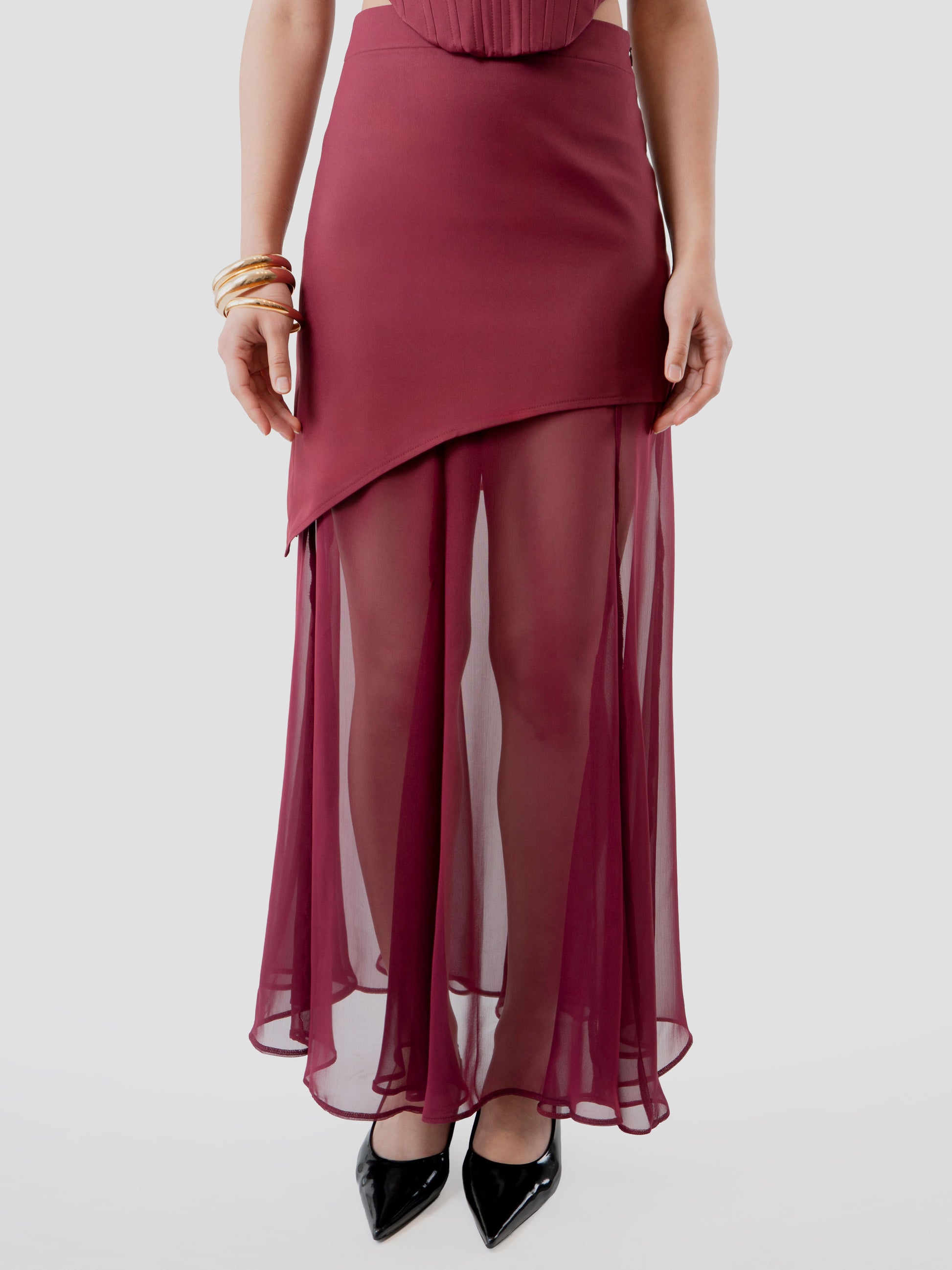 An asymmetrical skirt designed for fluid, elongated movement, with layered panels that sculpt the silhouette.