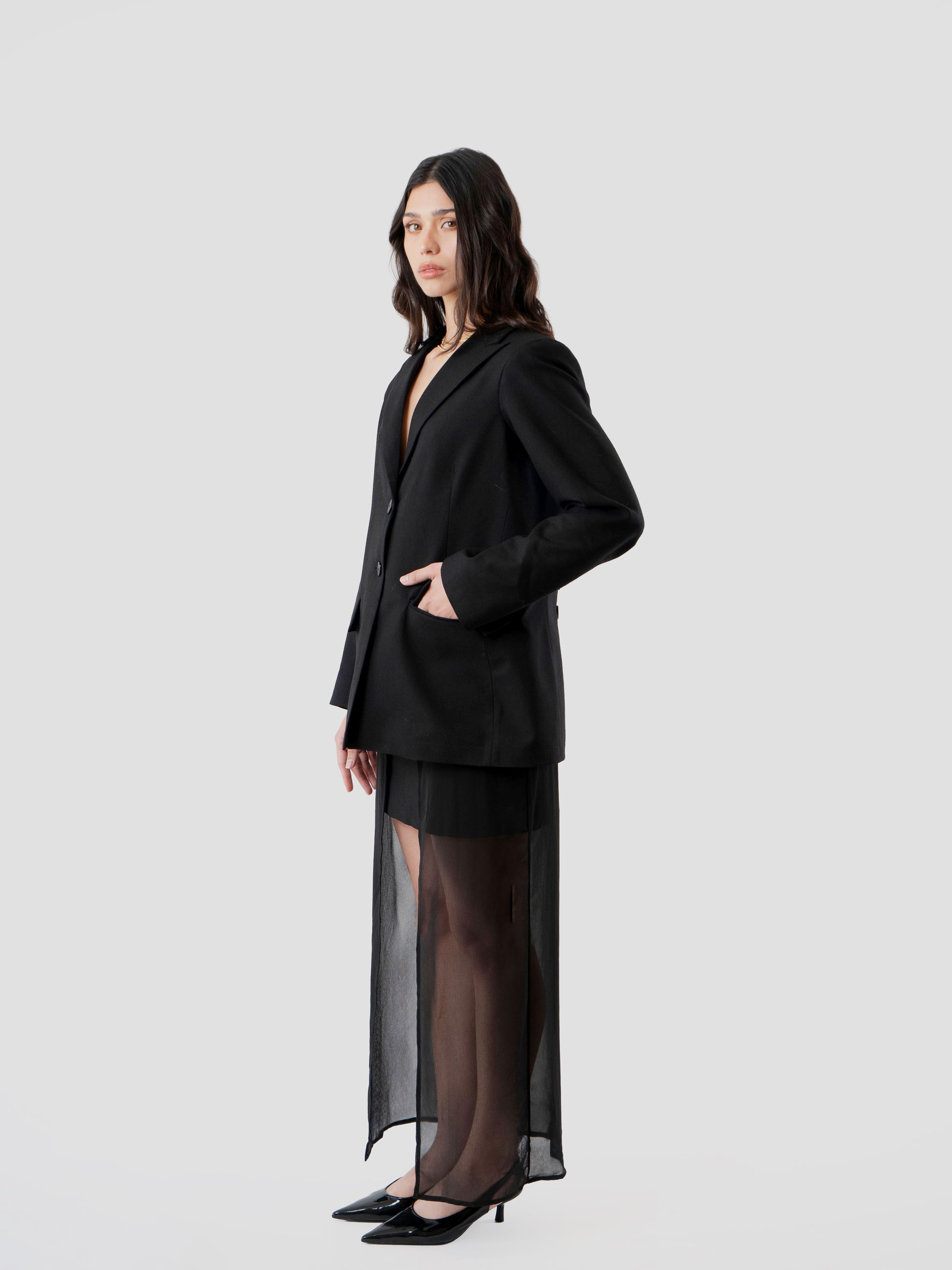 The Shadow Skirt is a tailored mini skirt designed with a detachable sheer overlay that transforms the silhouette. The contrast between structure and fluidity allows the piece to shift from sharp to ethereal, offering versatility through movement and styling.